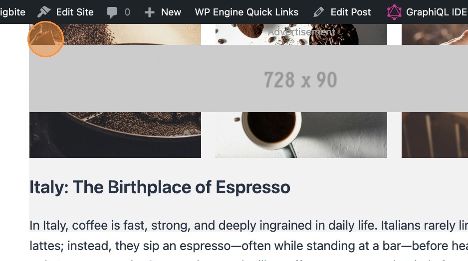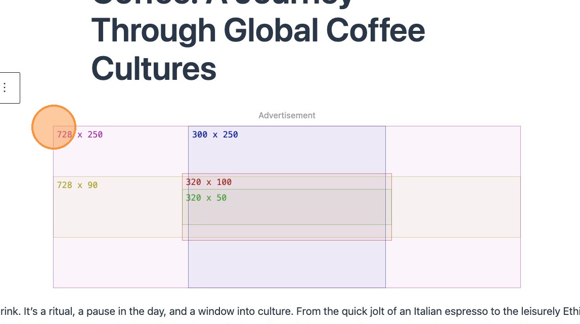 When you add an ad slot to your post you will see a placeholder appear, outlining the different sizes that Google may opt to show in that slot. There are multiple ways to include an ad slot in your post.