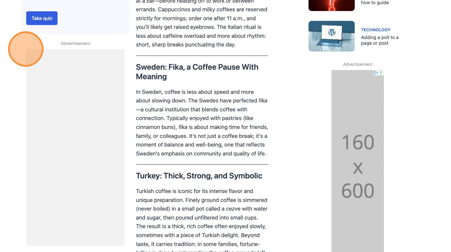 However, if your ad is more specific to a section of the content, and you require the ad to be in view whilst the reader scrolls through that section of content, then applying grouping to the section of content would be necessary. The following clip demonstrates this.